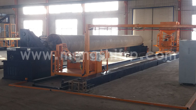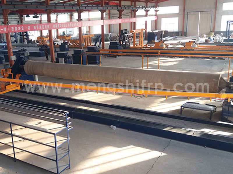 MSFW-3000型玻璃鋼夾砂管道生產(chǎn)線主要裝備:由兩套攪拌罐、制襯機、夾砂纏繞機、四套固化站、修整機、龍門脫模機、試壓機等組成,各單機按生產(chǎn)夾砂管道流水線進行布置。