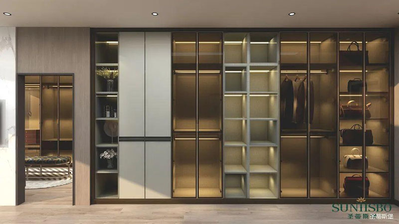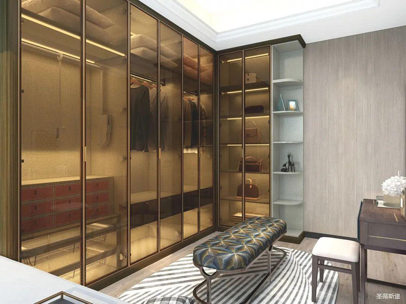 衣帽間開放式置頂設(shè)計,在追求簡單到極致的基礎(chǔ)上,給人感官一種簡約整潔的整體感受。打破常規(guī)的空間儲藏方式,脫離一切浮華與不實用,僅用最簡單的線條反映出主人優(yōu)雅的高品味。