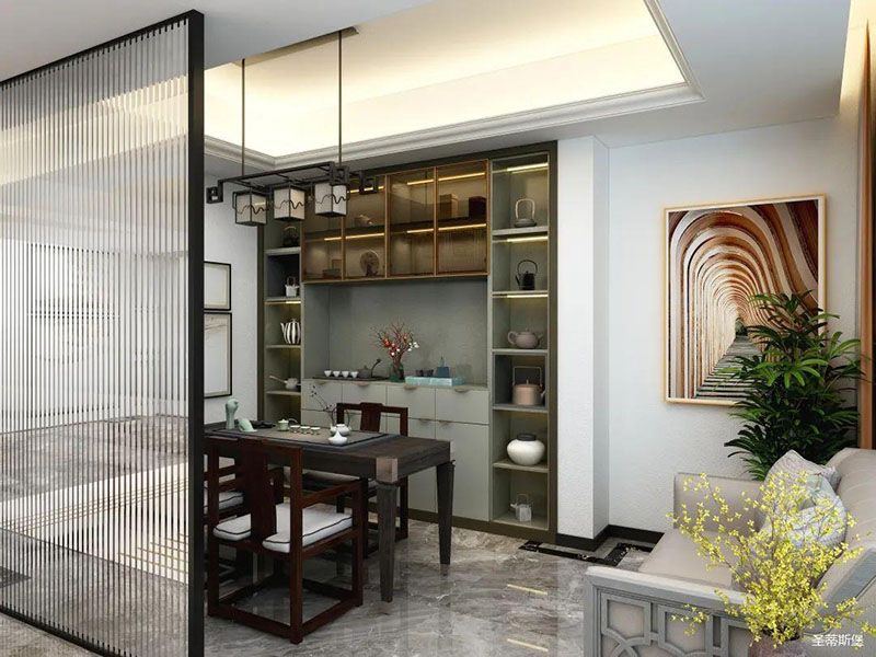 客廳與茶室之間以長虹玻璃隔斷,有效的劃分功能區(qū),為空間展現(xiàn)一番“猶抱琵琶半遮面”的東方意境美。茶室將意式極簡與傳統(tǒng)風(fēng)格糅合,摒棄繁雜、刻板的形式,以含蓄的現(xiàn)代極簡詮釋著東方美學(xué),展現(xiàn)著傳統(tǒng)的待客之道。實木與鎢金金屬質(zhì)感碰撞,有棱有角,高級感頃刻得到了升華。