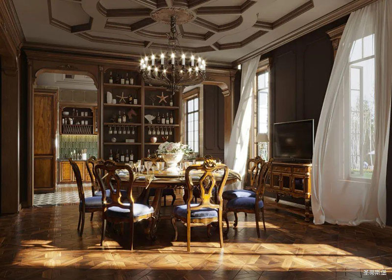 進(jìn)入客廳,純正美式城堡氣息撲面而來(lái),大理石電視背景墻被實(shí)木對(duì)稱鑲嵌,兩側(cè)置頂實(shí)木酒架更添美式風(fēng)情。純正美式風(fēng)格沙發(fā),被流暢光滑的實(shí)木線條包圍,邊角之處盡顯柔美,真皮搭配全實(shí)木藝術(shù)雕刻,貼心的軟包設(shè)計(jì),讓脊椎盡情舒展。霸氣獸腳茶幾,將美式的粗獷大氣體現(xiàn)的淋漓盡致,精美絕倫的實(shí)木單椅在樸實(shí)自然的背景里顯得格外精致美好!
