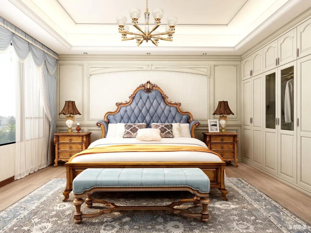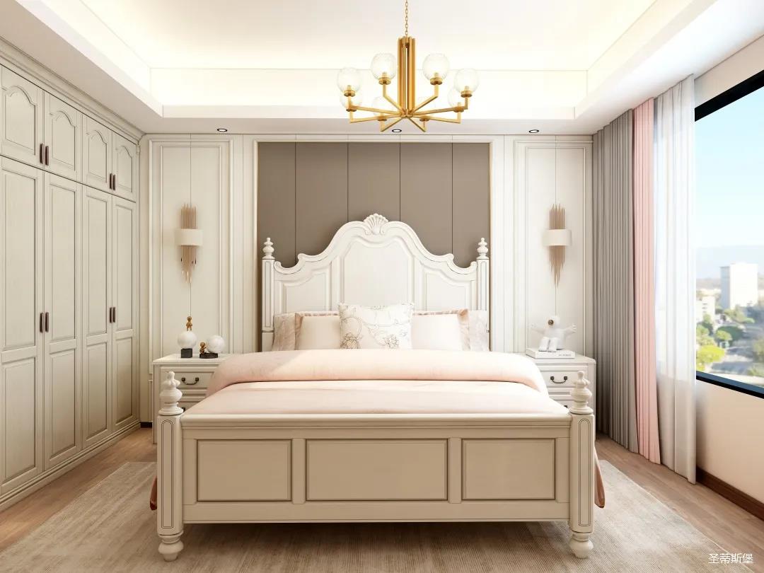 次臥的設計更注重收納,人性化嵌入式書桌,整排衣柜設計有效的利用了空間每一個角落。床屏在保持原有美式家具特色的同時,增加了線條美,將繁雜的雕琢簡化,并融入時尚的美式元素,壁燈,吊燈糅合自然光影,完美呈現(xiàn)出尊貴的空間格調。