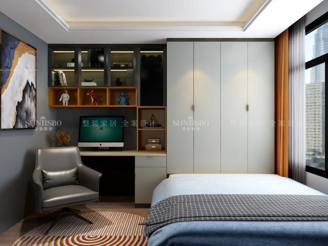 設(shè)計(jì)師運(yùn)用最為百搭淺灰實(shí)木護(hù)墻板打造主臥空間,簡(jiǎn)約的線條縱橫交錯(cuò),帶來(lái)了干凈、清爽、舒適的視覺(jué)效果。明暗分區(qū)的衣柜在燈光的渲染下,虛實(shí)光影變換其中,為每個(gè)角落氤氳出浪漫的氣息。