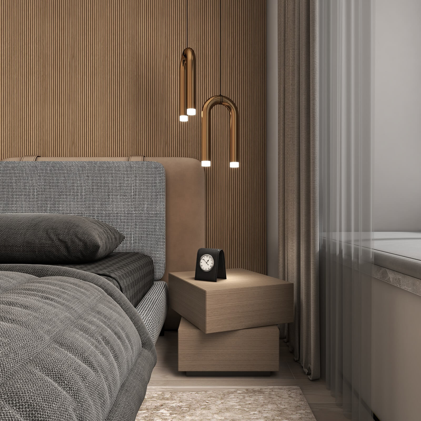主臥的一切設(shè)計,都有助于睡眠氛圍的營造,黑棕色配合沉靜的物件,從材料到觸感,強(qiáng)調(diào)事物質(zhì)樸的內(nèi)在,能夠展示高端定制木作的本質(zhì)之美。
